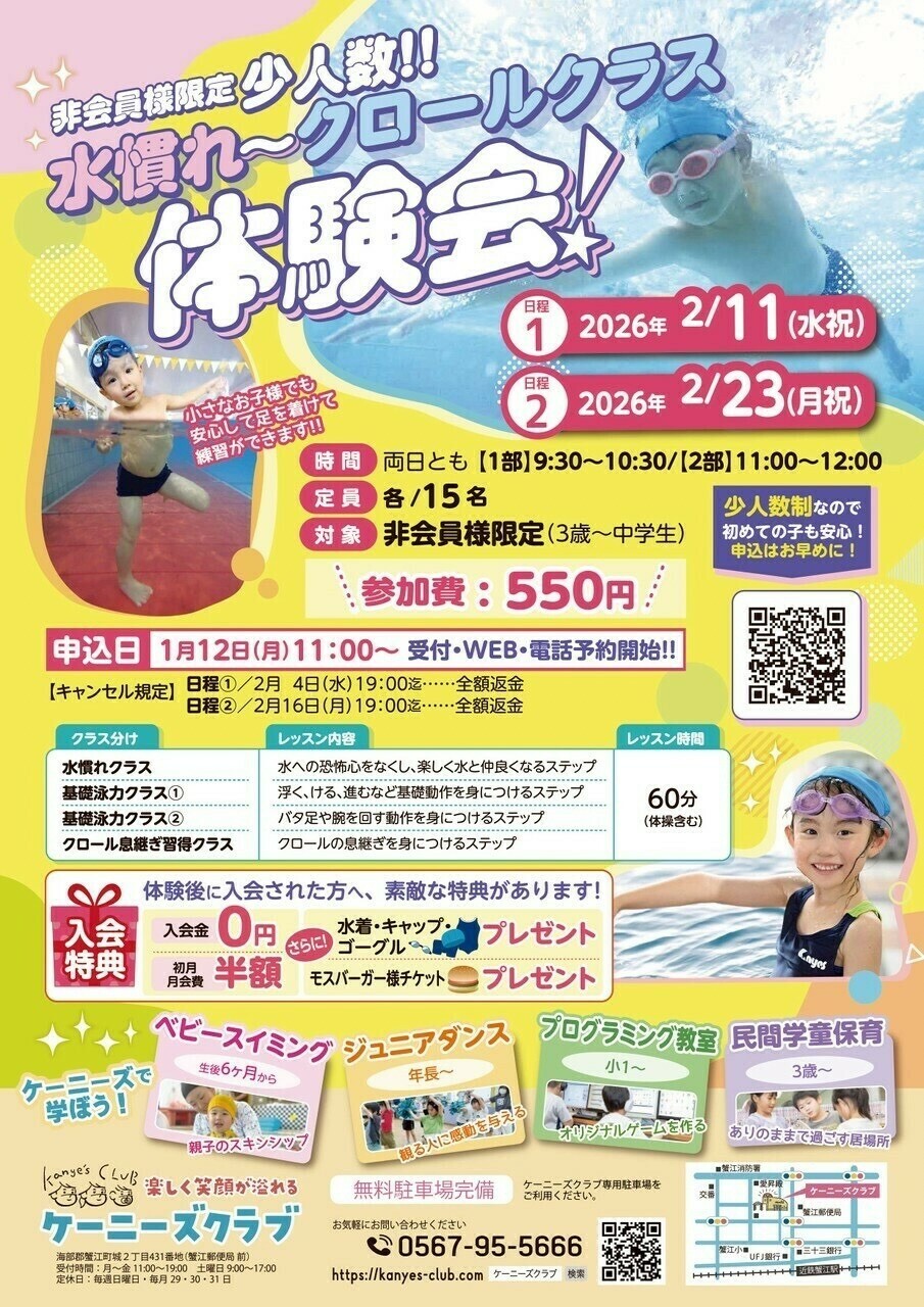 2月11日(水祝)・23日(月祝)に非会員様限定の水慣れ~クロールクラス体験会を行います。